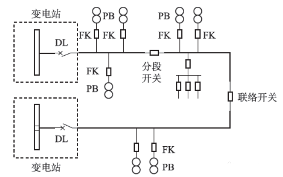 如下圖所示,其作為現(xiàn)階段典型的配電系統(tǒng)拓?fù)鋱D,變電站的10kV出線配置斷路器和對(duì)應(yīng)保護(hù),主線路中引用開關(guān)分段,各分支線路結(jié)合負(fù)荷開關(guān)的方式進(jìn)行配置,且全部開關(guān)都具有合閘等功能。因?yàn)榉侄伍_關(guān)與負(fù)荷開關(guān)在運(yùn)行期間,難以斷開短路電流,所以不需要安裝保護(hù)設(shè)施。其中,圖中的DL屬于斷路器,FK屬于負(fù)荷開關(guān),而PB是配變。