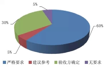 針對參與者所觸摸到的項目,環(huán)繞是否對固體絕緣環(huán)網(wǎng)柜產(chǎn)品的功用有嚴格要求與否,認為有嚴格要求的占比60%;主張參看的占比5%;驗收方確認的占比30%;無要求的占比5%。如圖5所示。