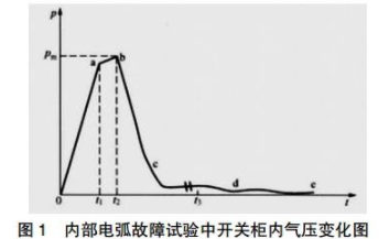 內(nèi)部故障產(chǎn)生的損壞力與電弧產(chǎn)生的間隔容積,電弧電壓,持續(xù)的時間,短路電流大小有關(guān)。在電弧產(chǎn)生后,柜體內(nèi)的壓力進程如圖1所示,壓力進程可以分為四個物理階段如圖1。